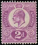 Для замены находившейся в то время в обращении стандартной двухцветной марки номиналом в 2 пенса была выпущена новая двупенсовая марка фиолетового цвета («финикийская слива») с изображением короля Эдуарда VII. Было напечатано 100 тысяч листов (24 000 000 марок) и распределено по почтовым отделениям страны. Запуск марки в обращение планировался единовременно, по израсходовании существовавших запасов старого дизайна. В связи со смертью Эдуарда VII эти планы не были воплощены в жизнь. Весь тираж был уничтожен (есть вероятность, что осталось несколько экземпляров). Единственный случай использования марки — на письме, отправленном тогдашним принцем Уэльским, позднее королём Георгом V[19], самому себе. Это письмо ныне хранится в Королевской филателистической коллекции и регулярно экспонируется на выставках. В каталоге «Скотт» марка не упоминается: официально она не поступила в обращение, хотя принц Уэльский, используя служебное положение, и доказал обратное.