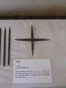 Также в ранних упоминаниях, например, в «Осака-гунки» (Военная повесть замка Осака), есть записи о коротких ножах и мечах, которые использовались как метательное оружие, а также о том, как самурай Миямото Мусаси в одном из поединков убил своего противника точным броском.