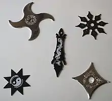 Сюрикэн (яп. 手裏剣) (дословный перевод: «сю» — рука, «ри» — держать, «кэн» — меч) — это металлические стрелки и ножи длиной от десяти до двадцати сантиметров с заточкой как на одном, так и на обоих концах. Сюрикэн — японское метательное оружие скрытого ношения (хотя иногда использовалось и для ударов). Представляет собою небольшие клинки, изготовленные по типу повседневных вещей: звёздочек, игл, гвоздей, ножей, монет и так далее.