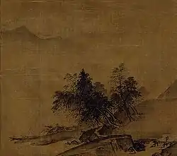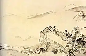 В пейзажах предпочитал асимметричные композиции, упразднение деталей, беспокойные состояния природы (таков его известный свиток «Буря»).