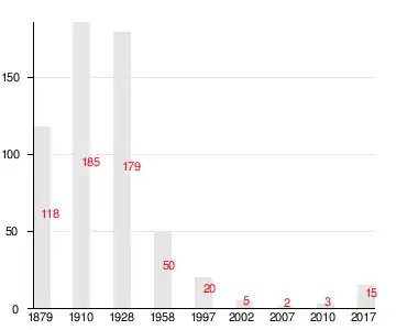 Число жителей по семейным спискам 1879 г.: 57 м. п., 61 ж. п.; по приходским сведениям 1879 г.: 59 м. п., 64 ж. п.[4]