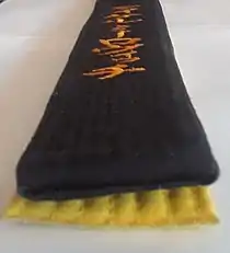 Также, в отличие от цветных поясов, чёрный пояс изготовляется именным, с вышитым именем владельца. Технология изготовления черных поясов отличается от «цветных» ученических. В то время как цветные пояса меняются, чёрный пояс, в идеальном случае[2], остается один на всю жизнь, и поэтому он шьется очень толстым и прочным. В то время, как цветные пояса являются просто покрашенной тканью, черный пояс — не красится. В его основе лежит белый пояс, обшитый поверх тонкой черной тканью. По мере тренировок черная ткань поверхности истирается и рвется, сначала мало, потом все больше. Часто можно видеть, что у многих тренеров черная ткань висит на белом поясе лохмотьями — это свидетельство активных тренировок, а не неопрятности. Когда черная ткань полностью сойдет и останется чистый белый пояс — считается, что человек достиг вершин мастерства.