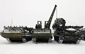 ![]() Слева-направо: ПУ 9А83 с поднятыми ТПК, командный пункт 9С457, РЛС кругового обзора 9С15М на международном форуме «Технологии в машиностроении 2012». | |