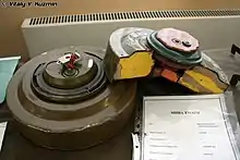 ТМ-62М - (индекс обозначает материал корпуса: М-металл, Т-ткань, Д-дерево, Б-безкорпусная) противотанковая мина нажимного действия. Применяется со взрывателями типа: МВЧ (минный взрыватель с часовым механизмом замедления), МВП (...с пневматическим механизмом замедления), МВШ (...со штыревым датчиком цели). Взрыв происходит при наезде гусеницей танка или колесом автомобиля на верхнюю крышку мины.