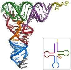 Транспортная РНК, тРНК[1] — рибонуклеиновая кислота, обеспечивающая взаимодействие аминокислоты, рибосомы и матричной РНК (мРНК) в ходе трансляции. Имеет типичную длину от 73 до 93 нуклеотидов и размеры около 5 нм. тРНК, будучи ковалентно связаны с остатком аминокислоты, принимает непосредственное участие в наращивании полипептидной цепи, специфически присоединяясь к кодону мРНК и обеспечивая необходимую для образования новой пептидной связи конформацию комплекса.