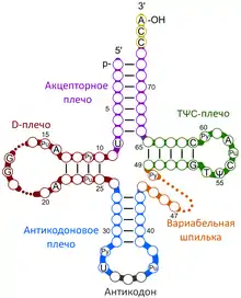 Вторичную структуру тРНК обычно визуализируют в виде клеверного листа с четырьмя плечами. Более длинные тРНК имеют короткое дополнительное пятое плечо, называемое вариабельной шпилькой. В трёхмерном пространстве молекула тРНК за счет коаксиального наложения спиралей сложена в L-образную структуру, которая позволяет тРНК вписываться в P-сайт и A-сайт рибосом[2]. Длина плеч и диаметр петель во вторичной укладке молекулы тРНК варьирует от вида к виду[2][3]. Основными составляющими молекулы тРНК являются следующие структуры и функциональные группы: