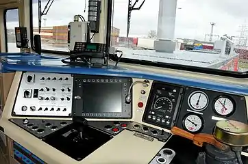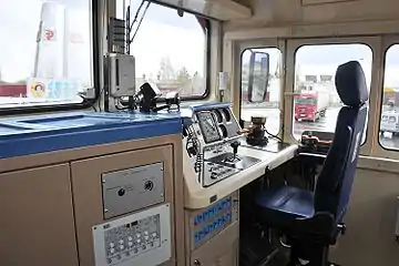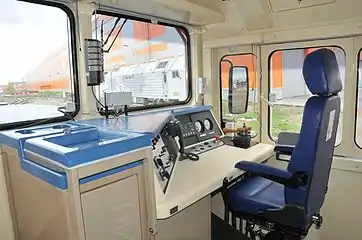 Кабина машиниста оснащена двумя пультами управления, расположенными с правой стороны относительно направления движения. Основной пульт управления расположен со стороны большого капота; пульт со стороны малого капота имеет меньшее число приборов. Вход в кабину осуществляется через торцевые двери в левой части. В потолочной части кабины установлен кондиционер.[3]