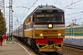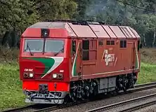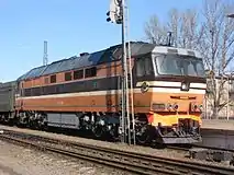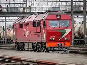 ТЭП70-0261 в тёмно-красной окраске Латвийских ЖД с жёлтыми полосами