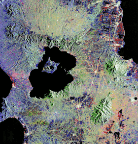 ![]() Озеро и кратер Тааль. Изображение спутника с бортовой РЛС. | |