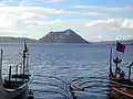 Вид на вулкан Тааль с озера, на переднем плане — лодки местных рыбаков.