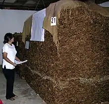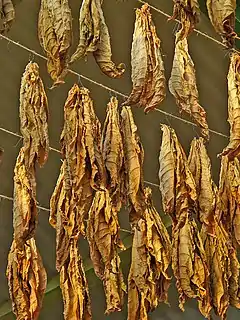 После уборки растения подвергают сушке и ферментации прямо на солнце или в особых помещениях с искусственным подогреванием, называемых огневыми сушилками. Ферментация табака идёт или одновременно с сушкой, или же до сушки, хотя в последнем случае эта операция требует более знаний и опытности вследствие возможности загнивания свежих листьев, сложенных в куче. Сушат табак в обыкновенных навесах или же специальных зданиях из кирпича или дерева с боковыми просветами, закрывающимися на случаи ненастья; навесы и здания делают сравнительно высокими ввиду того, что верхние партии дают сушёный продукт более добротным. С целью сушки листья табака нанизывают на бечевку или прутья и размещают в сушильнях. Сушка табака прекращается по уменьшении влажности листьев приблизительно до 18 %, затем весь высушенный материал складывается в кучи для ферментации. Сушку обыкновенно делят на три момента: в первом из них, связанном с некоторой ферментацией, обнаруживаемым в пожелтении или коричневом цвете листьев, происходит так называемое томление, приурочиваемое к температуре 40 °С; во второй момент происходит уже собственно сушка табака при температуре 77—100 °С; в третий период высыхают уже черешки и прожилки листьев. Для окончательной ферментации высушенные листья сваливают в кучи, затем после ферментации мелкие кучи соединяют в более крупные, в которых табак и сохраняется в течение нескольких лет, если принуждают к этому обстоятельства; здесь следует заметить, что от подгнивания, иногда замечаемого в кучах, обсыпки и могут достигать 30 % и более[9][11].