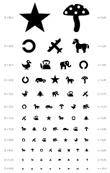 - Если ребёнок не сможет назвать картинку в определённом ряду, то указывают все остальные картинки данного ряда, затем выше расположенного ряда и так далее (пока не будет правильно названо подавляющее число картинок в одном ряду). Этот ряд и определит остроту зрения у обследуемого ребёнка.