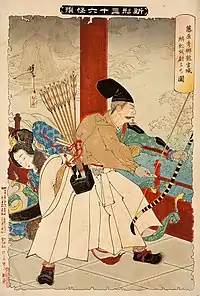 В былые времена, когда Фудзивара-но Хидэсато (который жил в первой половине X века), пересекал озеро через мост, поперёк него лежал большой змей. Герой, однако, нисколько не смущаясь, спокойно перешагнул через чудовище, которое сразу же нырнуло в воды озера и возвратилось в облике красивой женщины. Прекрасная незнакомка сказала, что две тысячи лет живёт она под этим мостом, но никогда ещё не встречала такого храброго человека. По этой причине она просит его уничтожить своего лютого врага, гигантскую сколопендру, которая убила её сыновей и внуков. Хидэсато пообещал ей сделать это, и, вооружившись луком и стрелами, остался поджидать сколопендру на мосту. Тут сползли с вершины горы Миками (Микамияма) два огромных фонаря, светящие так же ярко, как двести факелов. Это были глаза сколопендры. Хидэсато послал в направлении огней три стрелы, после чего свет погас, и монстр умер. Дракон-принцесса, исполненная радостью и благодарностью взяла героя в свой великолепный дворец, где угостила его разными вкусными кушаньями и наградила его отрезом шёлка, мечом, доспехами, колоколом для храма и мешком риса («тавара»). Она сказала, что сколько бы ни отрезали шёлка, пока жив герой, он никогда не закончится. А мешок риса никогда не будет пустым.[1]