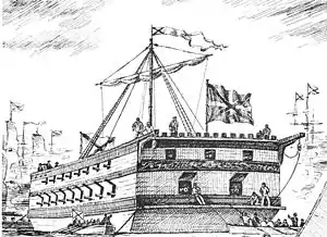 В 1723 году в Таврово прибыло около 14 тысяч мастеровых из Санкт-Петербурга и «работных людей» из Воронежа и других городов края. 8 (19) апреля 1723 года Петром I был подписан указ о строительстве в Таврове судов для будущего флота, предназначавшегося для борьбы с Турцией за выход в Чёрное море. Согласно приказу в апреле 1723 года на верфи были заложены семь 16-баночных галер типа «Вёдрая»[25] и восемь 18-баночных галер типа «Бодрая»[26], в том же году начали строительство девяти больших 44-пушечных двухдечных прамов «Близко не подходи», «Гром и молния», «Дикий бык», «Небоязливый», «Разгневный», «Северный Медведь», «Сердитый», «Спящий Лев», «Страшный»[27] и шести малых 8-пушечных однодечных прамов типа «Блоха» (головной прам серии), «Клоп», «Комар», «Овот», «Сверчок» и «Таракан»[28].