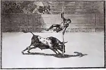 | Таврокатапсия на фреске из Кносса | Минойская фигурка прыгающего через быка | Тавромахия в Мадриде на гравюре Гойи |