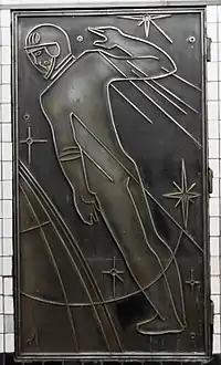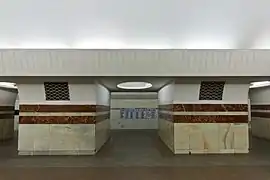 Пилоны станции облицованы белым мрамором и украшены двумя бордюрами из коричневого мрамора. Путевые стены отделаны керамической глазурованной плиткой, белой вверху и чёрной внизу, и украшены узкими металлическими панно на тему освоения космоса работы художника Э. М. Ладыгина. В феврале 2021 года начались работы по замене облицовки путевых стен на аналогичную плитку[3]. Пол на станции выложен красным и серым гранитом. Светильники, освещающие центральный зал и платформы, скрыты в широких карнизах над пилонами.