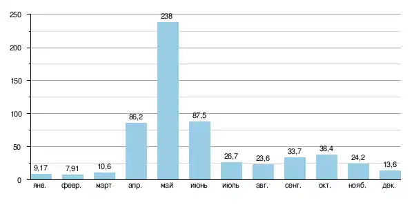 Питание реки смешанное: грунтовое, снеговое, летом и осенью — дождевое. Половодья проходят весной, главным образом в мае, за счет таянию снегов. С июня, уровень сильно падает, и достигает минимума в июле-августе. В сентябре-октябре уровень реки вновь поднимается и связан с осенними осадками. С декабря по март водосброс достигает минимального уровня.