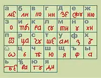 Большинство согласных в виде слога. Причём каждая согласная участвует только в одном каком-то слоге. Исключения составляют: буква Ф без слога и согласная З, которая используется как в слоге ЗЕ так и в одиночном исполнении З.