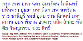 ![]() Полное название Бангкока на тайском языке; цветовая маркировка: чёрный — гласные, красный — высокие согласные; зелёный — средние согласные; синий — низкие согласные; коричневый — другие символы |