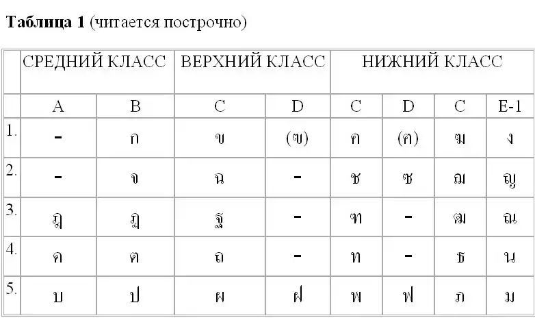 Тайское письмо, основанное на индийских системах письменности, заимствовало такое же расположение букв в алфавите. Тайская алфавитная система отражает своё индийское происхождение во многих формах, даже несмотря на то, что современное тайское произношение заметно отличается от первоисточника. Чтобы оценить систему, лежащую в основе соответствующих согласных, необходимо понять количество категорий представленных звуков. Таблицы, представленные здесь, являются модификацией традиционных тайских таблиц соответствий, в которых Таблицы 2 и 3, представленные ниже, в оригинале вообще помещены в единственный ряд, названный «разные согласные»: