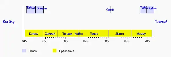 Эра Тайхо (красным) в сравнении с периодом правления Момму![]() | |