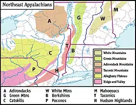 ![]() Северо-восточные Аппалачи. Таконик обозначен буквой «T». | |