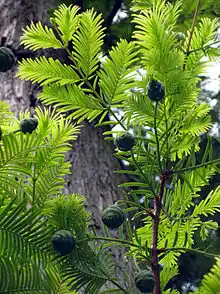 Листья перистые, линейные, с округлённой острой вершиной, мягкие, светло-зелёные, 16—18 мм длиной, двурядно (гребенчато) расположенные и осенью ежегодно опадающие вместе с укороченными побегом.