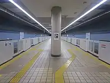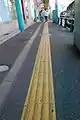 Тактильные покрытия установлены на платформе японской железнодорожной станции. Линейные направляющие блоки с выступающей одной полосой, в нижней части изображения указывают на границу безопасной «внутренней» стороны платформы противоположной от стороны где расположены рельсовые пути.
