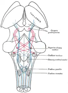 Таламус также тесно взаимодействует с полосатым телом, обмениваясь с ним информацией по так называемым таламостриарным волокнам[20]. С оливой таламус образует так называемый таламо-оливарный путь, он же центральный покрышечный путь[21].
