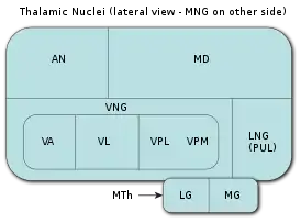 ![]() Список ядер таламуса: MNG = Срединная группа ядер AN = Передние ядра таламуса MD = Медиальное дорсальное ядро VNG = Вентральная группа ядер VA = Вентральное переднее ядро VL = Вентральное латеральное ядро VPL = Вентральное постеролатеральное ядро VPM = Вентральное постеромедиальное ядро LNG = Латеральная группа ядер PUL = Ядра подушки MTh = Метаталамус LG = Латеральное коленчатое тело MG = Медиальное коленчатое тело | |