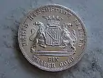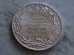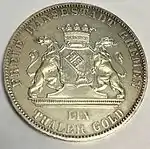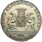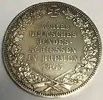 GOTT MIT UNS (рус. С нами Бог) | Герб Бремена. Круговая надпись «FREIE HANSESTADT BREMEN / EIN THALER GOLD» | Надпись «ZWEITES DEUTSCHES BUNDES- SCHIESSEN IN BREMEN 1865» (рус. Второй общенемецкий стрелковый фестиваль в Бремене 1865) в венке из дубовых ветвей и крест Ганзейского союза | 1865 | 50000[4] | 17,539 г серебра 986,11 пробы |