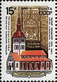 В 1990 году почта СССР эмитировала две марки, посвящённые Таллину, на которых название города писалось с двумя «нн», согласно принятой 7 декабря 1988 года поправке к русскому тексту Конституции Эстонской ССР. Первая марка с видом Старого города (шпили Длинного Германа, церкви Олевисте, Домского собора и башни ратуши) вышла в серии «Столицы СССР и союзных республик» (ЦФА [АО «Марка»] № 6180). Вторая — в серии «Памятники отечественной истории», на ней изображена церковь Нигулисте на фоне малого городского герба над Большими морскими воротами (ЦФА [АО «Марка»] № 6236). Это была последняя марка почты СССР, посвящённая Таллину.