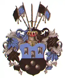 На щите — дворянский шлем. На нём — подушка голубая, серебряная и чёрная. Нашлемник: выходящие в каждую сторону по два знамени, чёрное и голубое, и между ними стоит, остриём вверх, серебряный меч с золотой рукояткой. Намёт на щите серебряный, подложенный голубым и чёрным.