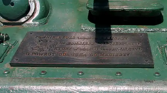 Оригинальный текст (польск.)[показатьскрыть]Pomnik – czołg T34 / 79 z I Brygady Pancernej im. Bohaterów Westerplatte, który w marcu 1945 r. walczył o powrót Gdańska do macierzy