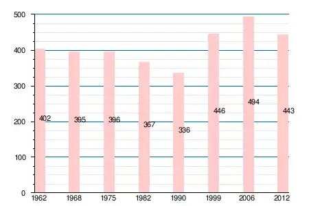 | 1962 | 1968 | 1975 | 1982 | 1990 | 1999 | 2006 | 2007 | 2008 | 2011 | 2012 |
