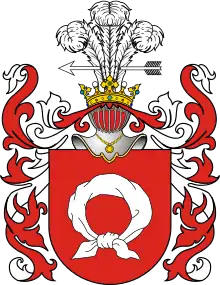 Щит увенчан дворянскими шлемом и короной. Нашлемник: три страусовых пера, пронзённых стрелой. Намёт на щите красный, подложенный серебром.