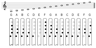 Аппликатура и звукоряд тансо (нотация указана на октаву ниже реального звучания)