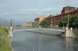 Мост пешеходный, также служит коммуникационным переходом через Обводный канал. Покрытие прохожей части моста эпосланбетон. Перильное ограждение металлическое простого рисунка, завершается на гранитными тумбами. На устоях моста установлены четыре металлических торшера освещения с четырехгранными фонарями, стилизованные в классическом духе[7].