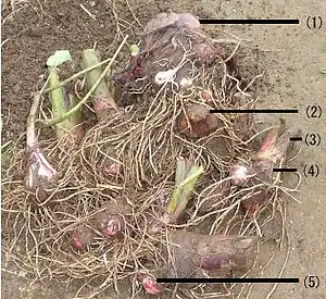 Корневая система мочковатая, образует крупный подземный клубень диаметром 6—8 см и массой до 4 кг, со множеством почек, часть из которых трогается в рост и образует вторичные, более мелкие клубни. Мякоть клубней у разных сортов может быть белой или окрашенной в кремовый, жёлтый, оранжевый, розовый или красный цвет.