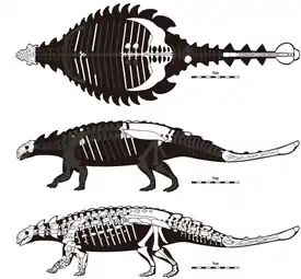 ![]() Скелетные реконструкции Tarchia tumanovae (голотип MPC-D 100/1353). На верхних двух диаграммах белым цветом отмечен известный материал, на нижней реконструирован весь скелет (с кожной бронёй). | |||||||||||||||||||||||||||||||||||||||||