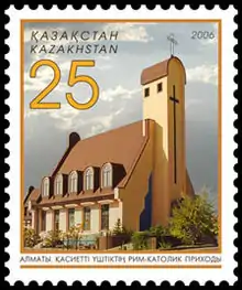 - Два похожих здания римско-католического костела Пресвятой Троицы на ул. Тлендиева, 9 (бывшая Софьи Ковалевской), в 2016 году «Казпочта» выпустила почтовую марку с изображением прихода.