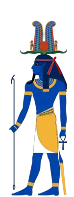 Изображался в виде человека с двойным султаном на голове[6] или в короне атеф.