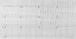 Фибрилляция желудочков на ЭКГ характеризуется хаотичными, нерегулярными, резко деформированными волнами различной высоты, ширины и формы. В начале фибрилляции обычно высокоамплитудные, с частотой 600 в мин — крупноволновая фибрилляция (на этом этапе прогноз при проведении дефибрилляции более благоприятен по сравнению с прогнозом на следующем этапе). Далее волны становятся низкоамплитудными, продолжительность волн нарастает, снижается их амплитуда и частота — мелковолновая фибрилляция (на этой стадии дефибрилляция не всегда эффективна).