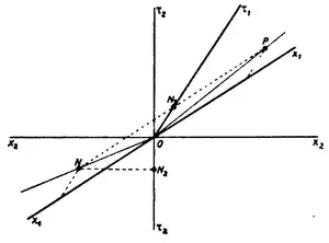 Толман использовал следующую вариацию мысленного эксперимента Эйнштейна[1][4]. Представьте расстояние, соединяющее конечные точки и . Пусть сигнал будет послан из и передаётся по направлению к со скоростью . Всё это измеряется в инерциальной системе отсчёта, где конечные точки находятся в состоянии покоя. Прибытие в точку определяется по формуле:
