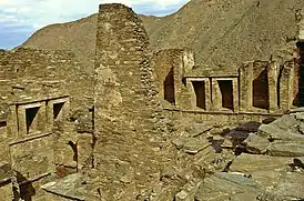 Дополнительные постройки здесь могли служить резиденцией, залами собраний или выполнять светские цели.[4] Все здания построены из местного камня с раствором из извести и глины.[4]