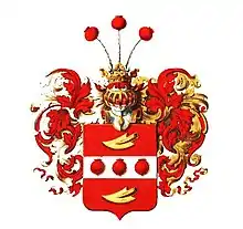Щит увенчан дворянским коронованным шлемом. Нашлемник: три червлёные маковые головки на серебряных стеблях. Намёт: справа червлёный с серебром, слева червлёный с золотом.