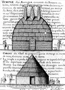 Социальная организация напоминала организацию близкородственного племени натчез — здесь также имелась сложная социальная иерархия и практика человеческих жертвоприношений. Главными божествами были солнце и змея. На вершине храма с куполом были изображения трёх орлов, обращённых ликами к восходящему солнцу, наружные стены и крыша из тростника были целиком выкрашены в красный цвет, и весь храм окружён деревянным палисадом из колов, на каждый из которых был насажен человеческий череп жертвы ранее совершённого человеческого жертвоприношения. Внутри храма стоял алтарь со связкой скальпов и горел огонь, который постоянно поддерживали два старых жреца. Когда вождь умирал, вместе с ним убивали его жён и челядь, чтобы их духи могли сопровождать вождя в загробный мир.