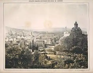 Тифлис — резиденция главноначальствующего грузинских областей и всех прилегающих к ним стран. Город этот расположен у подошвы горы; река Кура пересекает его во всю длину. В нём здоровый климат и прекрасная вода. Число его жителей свыше 20000. Из двух тысяч находящихся в нём домов едва лишь 150 или 200 грузинских; все остальные принадлежат армянам. Базар этого города состоит из свыше тысячи деревянных лавок; это складочное место товаров персидских, турецких и русских и местных произведений. Наиболее крупные торговые операции совершают армяне; только среди них и встречаются наиболее зажиточные.