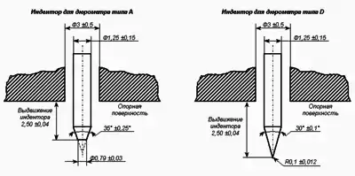 | D | Закалённый стальной стержень диаметром 1,25 мм, заканчивающийся конусом с углом при вершине 30°, радиус острия 0,10 мм | 0,445НD | ±0,441 | 45,36НD | ±45 | 5 кг (50,0 Н) |