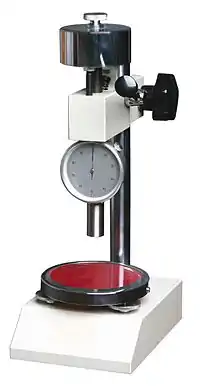 - Индикаторное устройство, показывающее степень выдвижения кончика индентора за пределы опорной поверхности. Степень выдвижения может быть измерена непосредственно в условных единицах в диапазоне от 0, для полного выдвижения кончика индентора, равного 2,50 мм + 0,04 мм, до 100 при отсутствии какого-либо выдвижения вообще, что происходит, например, в том случае, когда опорную поверхность индентора плотно прижимают к стеклянной пластинке.